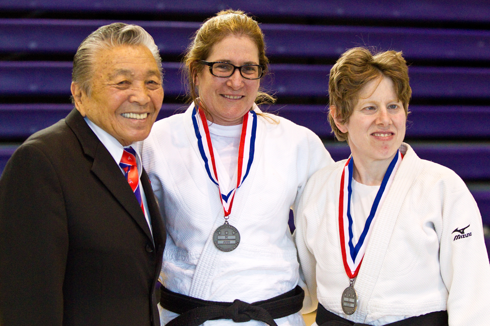 Kata medallists Tamara Hemingway and Cindy Simon congratulated by Sensei Jimmy Takemori