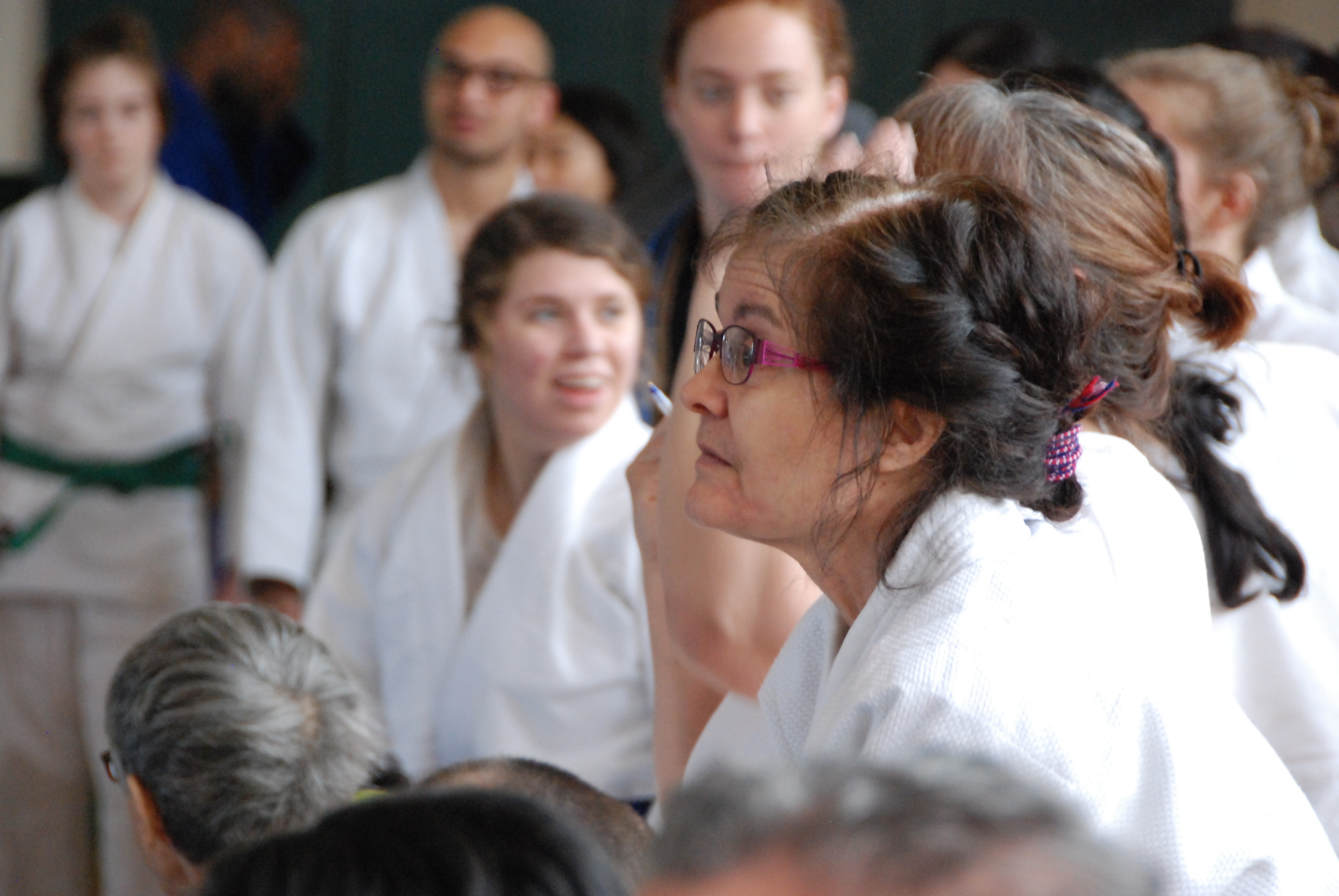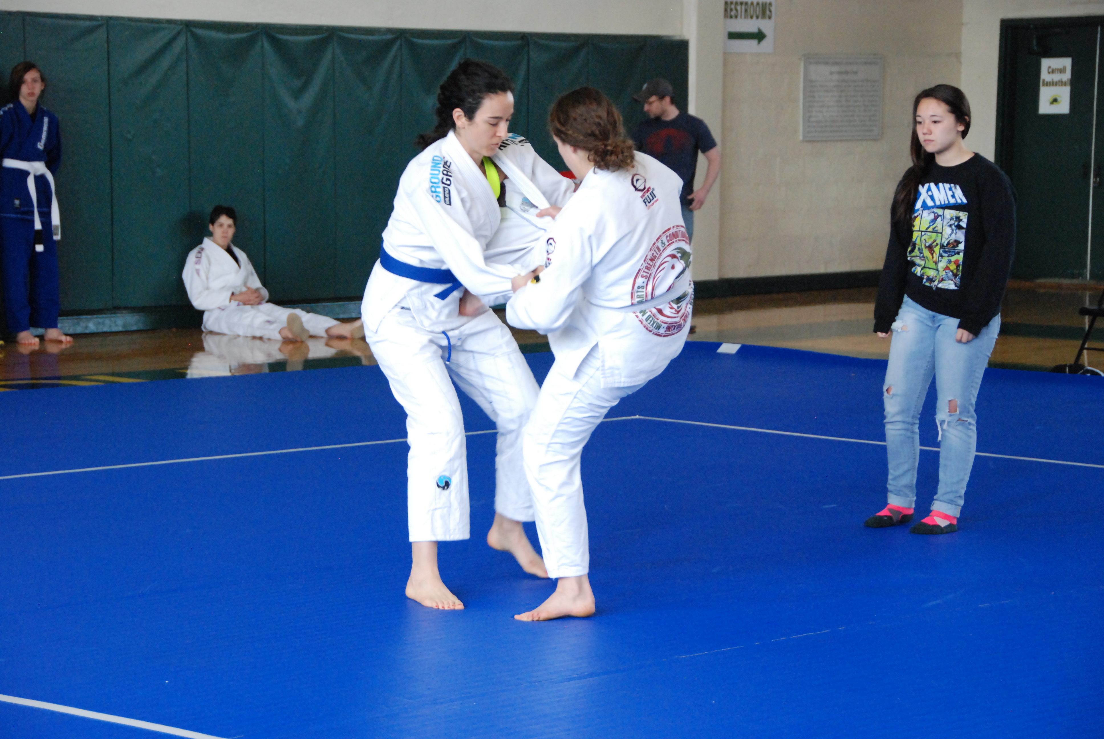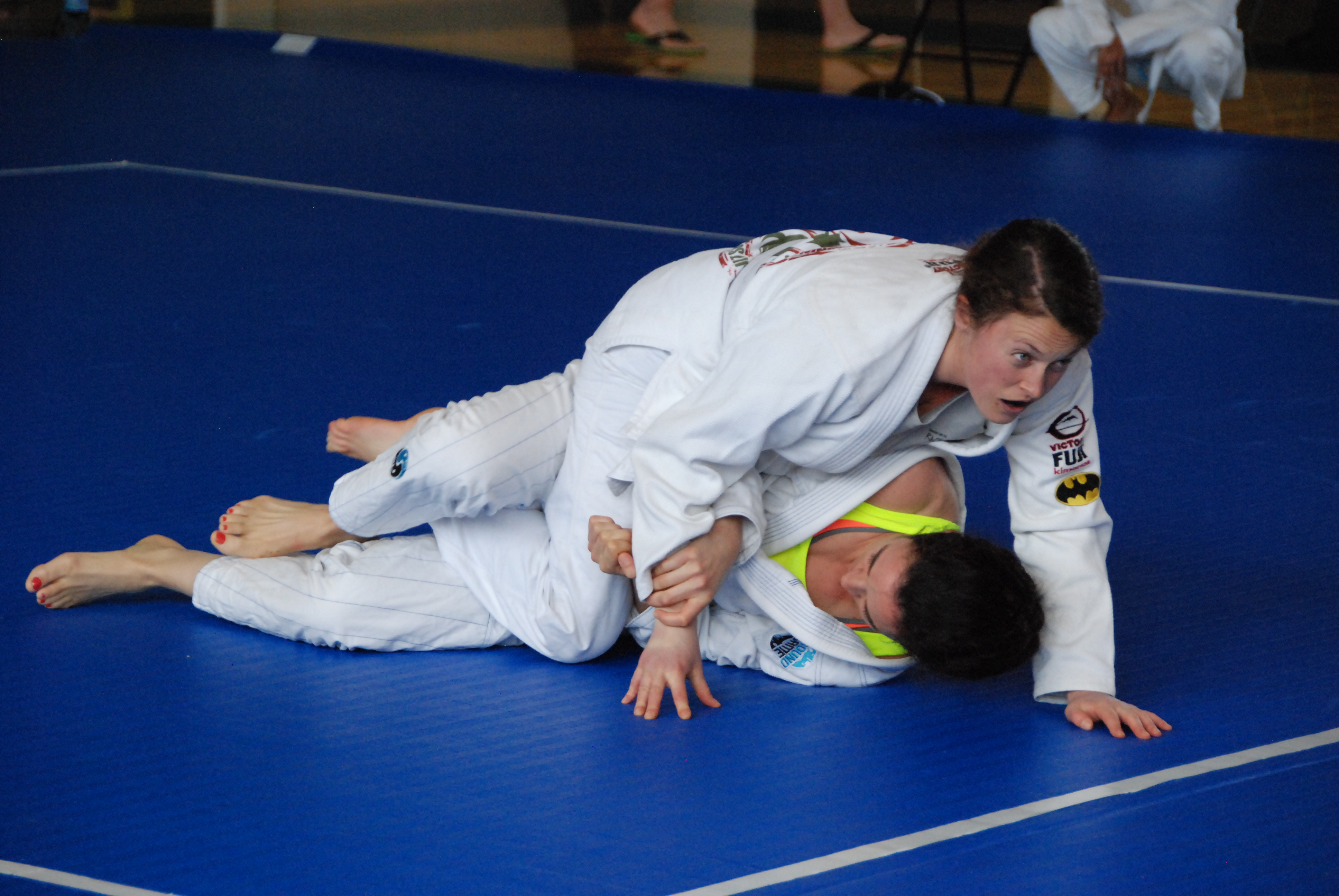 Crossing over is part of the fun. Jujitsuka Laurie Porsch (BETA) pins Judoka Jenae Michelle (DC Judo) in a Judo match.